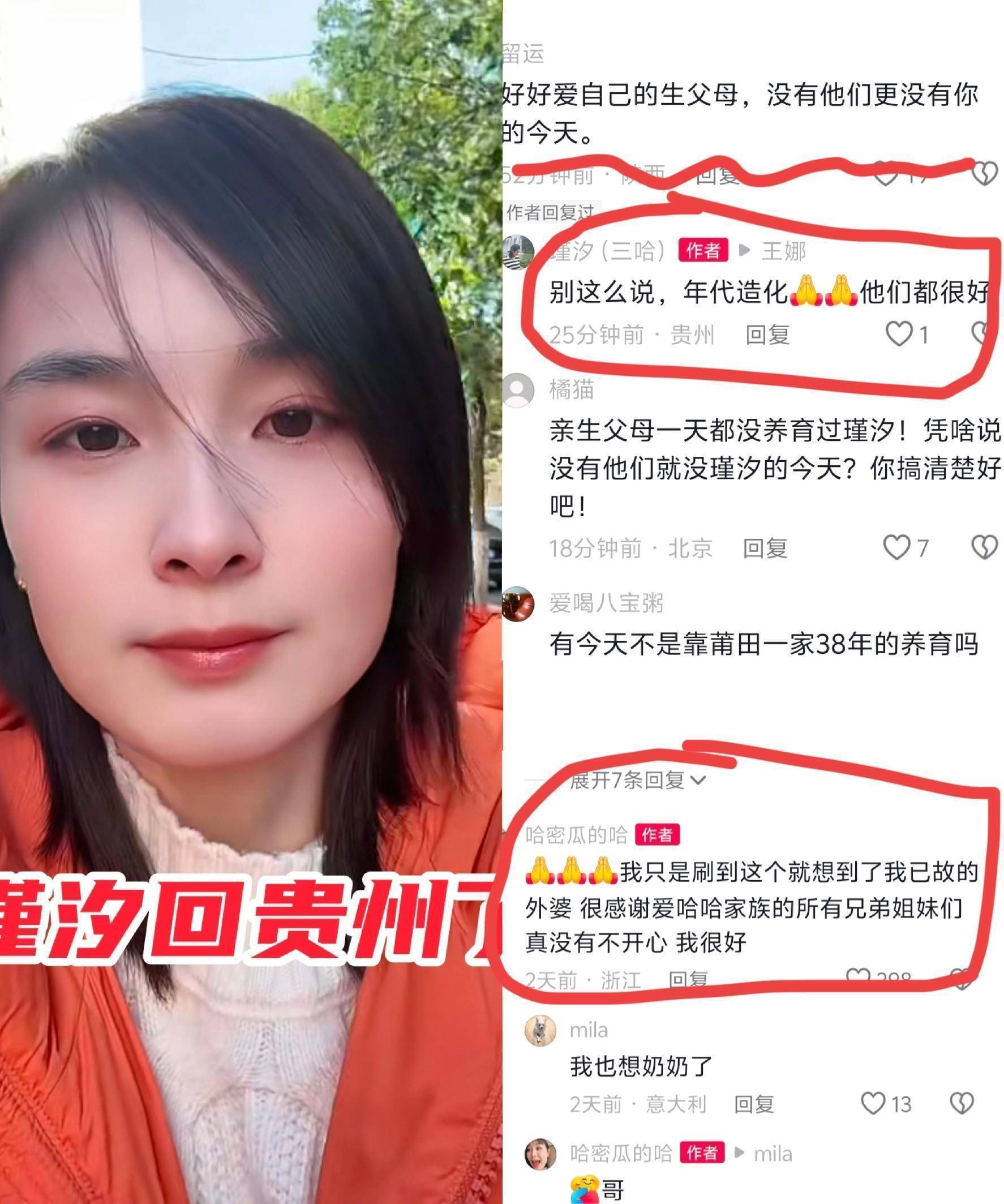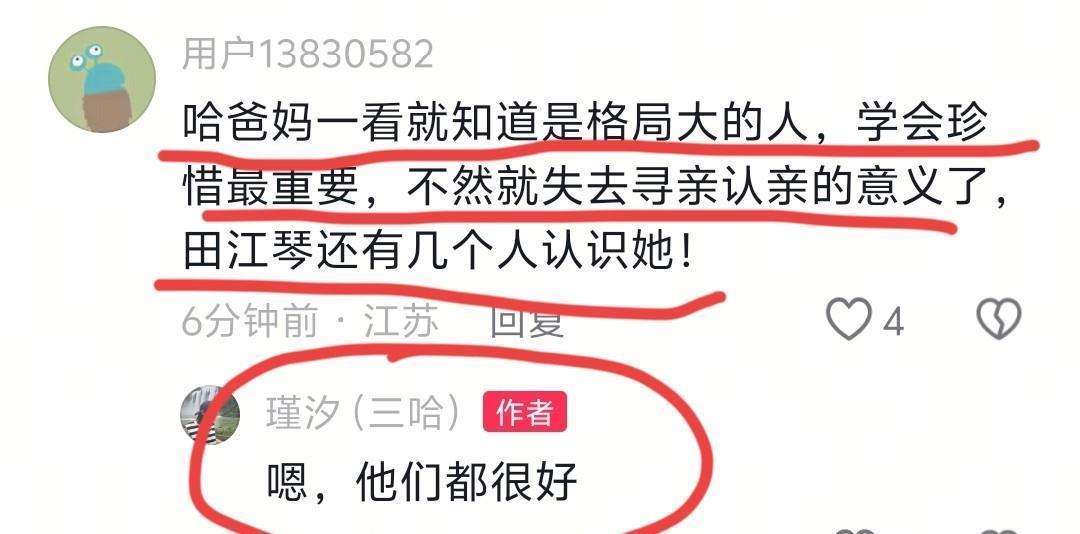 她两次在评论区提及温州爸妈都很好。有一位网友表示,哈爸哈妈是格局很大的人,让瑾汐要珍惜身边人,否则寻亲就失去了意义,还说瑾汐的闺蜜田江琴如今没了热度,没几个人认识她了。瑾汐回复该网友:“嗯,温州爸妈他们都很好。”