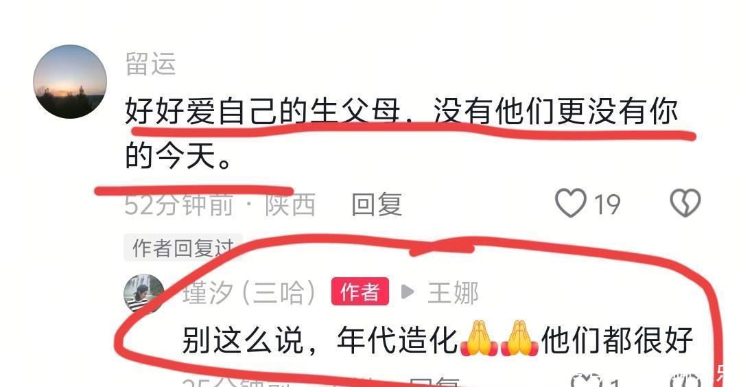 另有一位网友对瑾汐说,要好好爱自己的温州父母,毕竟没有亲生爸妈就没有瑾汐的今天。瑾汐则回复:“别这么说,年代造化,他们都很好。”